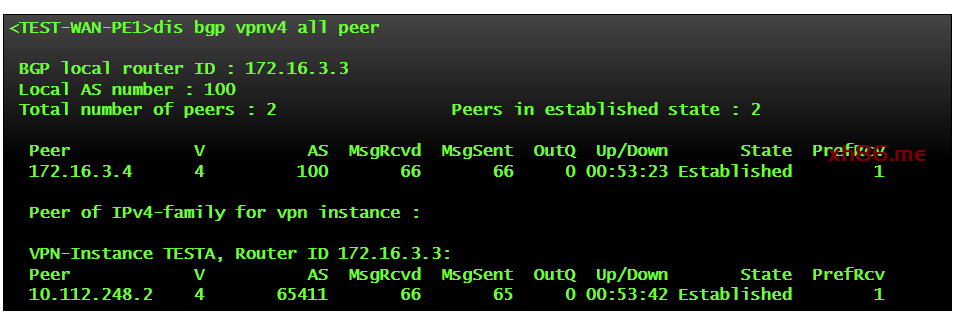 在PE1上查看BGP邻居关系,发现PE1和PE2在vpnv4地址族下邻居建立成功;PE1与CE1在VRF TESTA下邻居建立成功(PE2要与PE1、CE2建立成功)