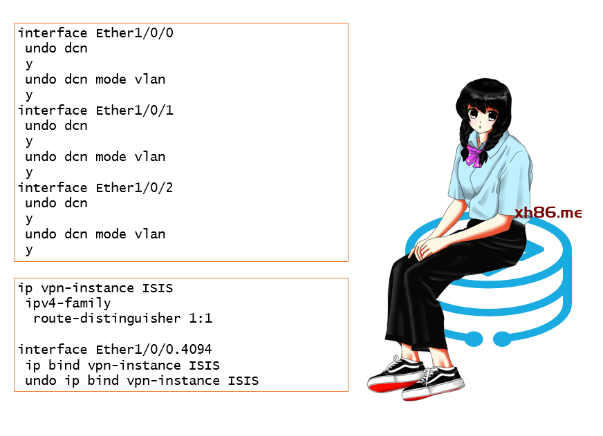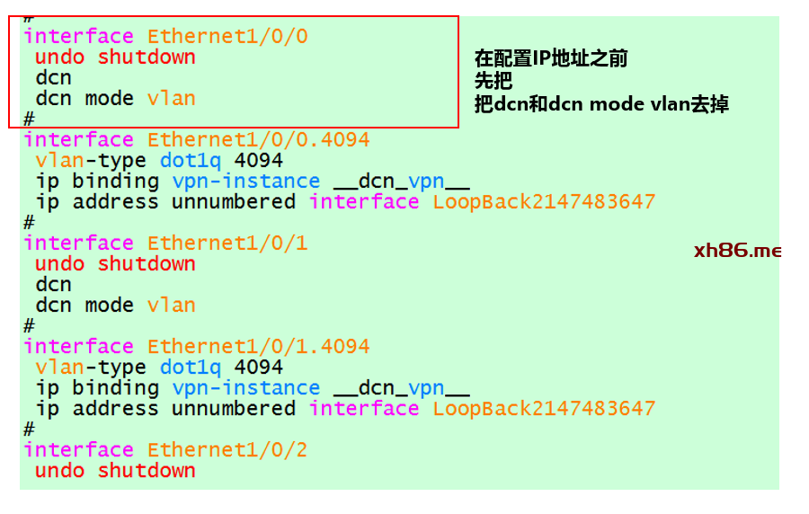 有个地方你还必须要先删掉,那就是每个物理接口下配置的“dcn”和“dcn mode vlan”最好还是删了,否则这个接口配置了IP地址以后也有ping不通的情况。