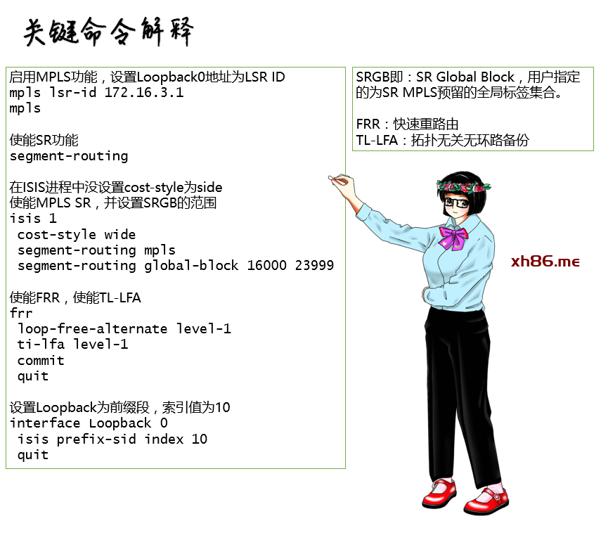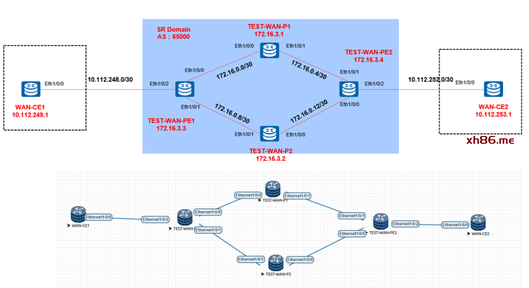 关于SR(Segment Routing:分段路由)的一些理论知识点在这里我就不多说了,有兴趣的读者可以去华为、H3C官网等看看手册。我在这里就直接上实验拓扑和配置脚本,并在关键的位置给一些必要的注释命令。