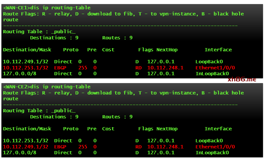在CE1和CE2上查看路由表,均能发现对方的Loopback 0地址,作为BGP路由被传递进来