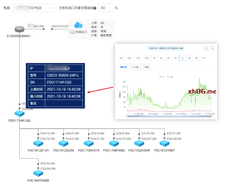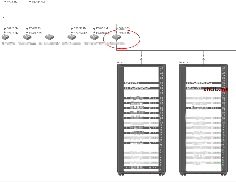 通过左键某个交换机即可查看当前机柜的服务器存放的位置和连接状态。