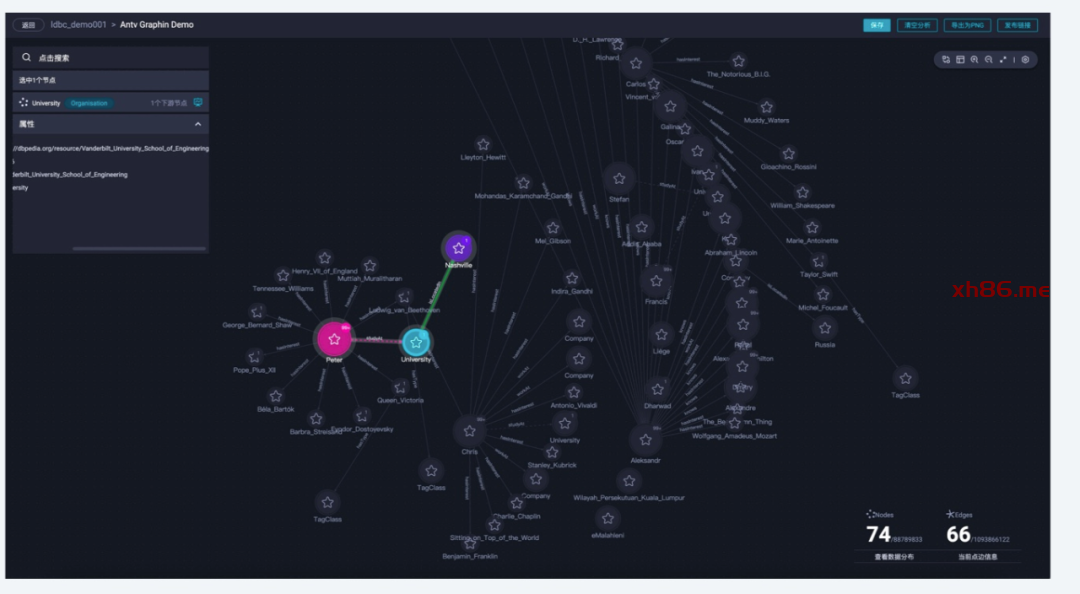 合适的场景采用合适的布局策略,必要时可以采用多种布局策略结合(子图布局)提升图的可读性。如下图可以描述的是围绕一个叫Peter的人展开的探索,可以清晰得到Peter在一个叫Nashville的地方度过的大学。