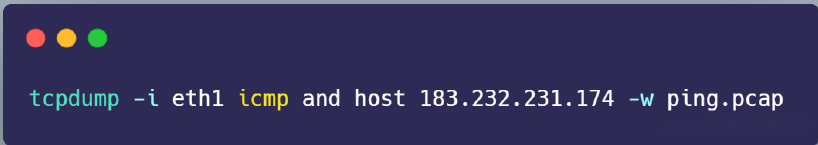 要抓取上面的 ping 命令数据包,首先我们要知道 ping 的数据包是 icmp 协议,接着在使用 tcpdump抓包的时候,就可以指定只抓 icmp 协议的数据包:
