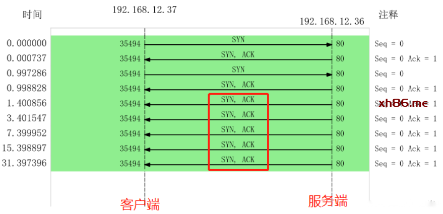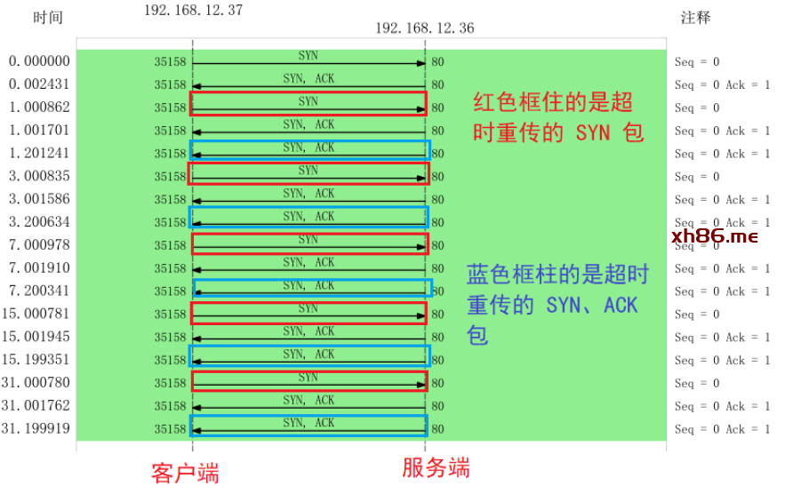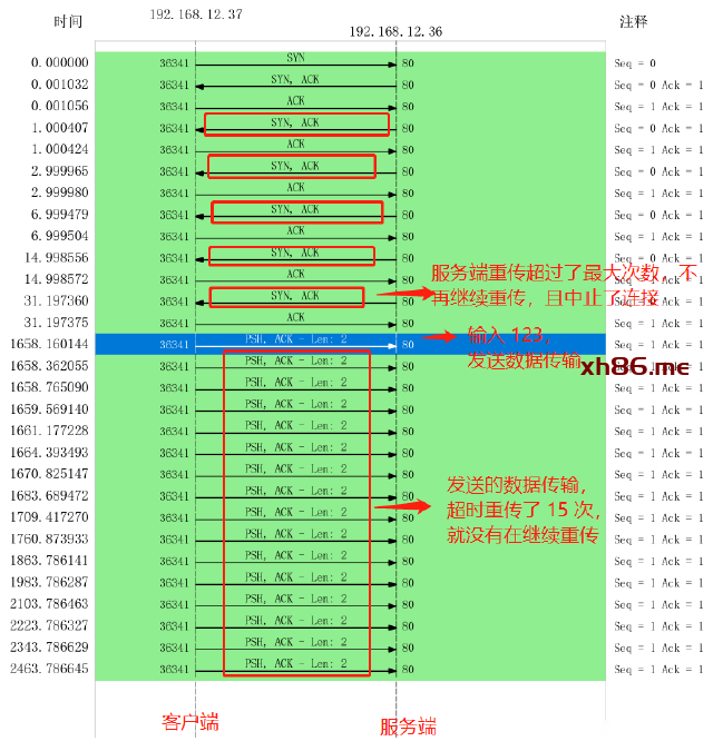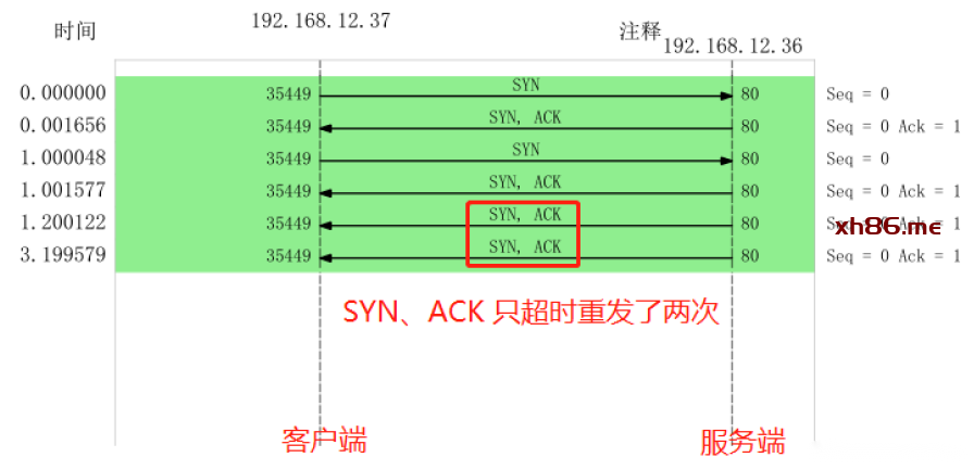 由上图可见:客户端的 SYN 包只超时重传了 1 次,符合 tcp_syn_retries 设置的值;服务端的 SYN、ACK 超时重传了 2 次,符合 tcp_synack_retries 设置的值。