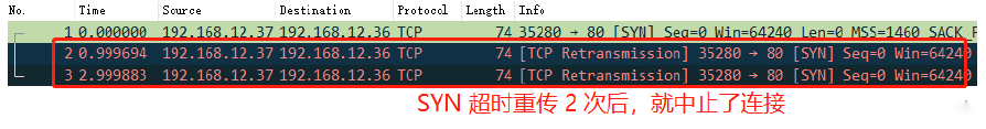 从上图,我们可以分析出:客户端的 SYN 只超时重传了 1 次,因为 tcp_syn_retries 值为 1
