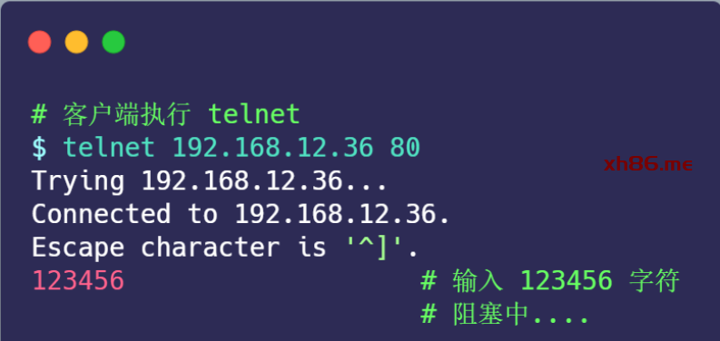 接着,在刚才客户端建立的 telnet 会话,输入 123456 字符,进行发送: