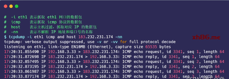 那么当 tcpdump 抓取到 icmp 数据包后, 输出格式如下:时间戳协议源地址.源端口 > 目的地址.目的端口网络包详细信息