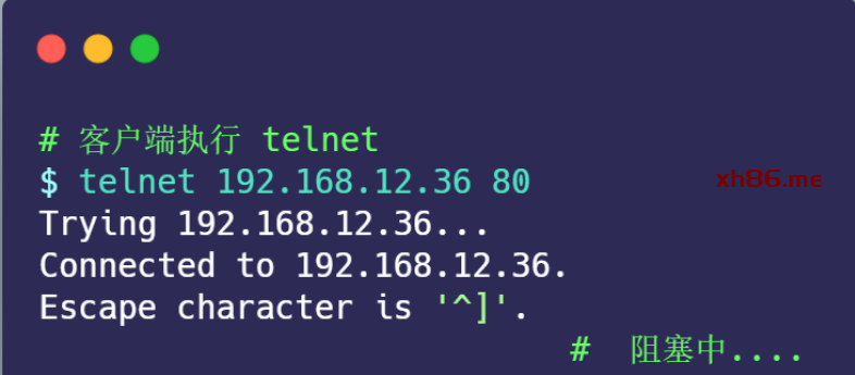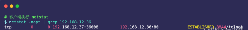 然后,客户端向服务端发起 telnet,因为 telnet 命令是会发起 TCP 连接,所以用此命令做测试: