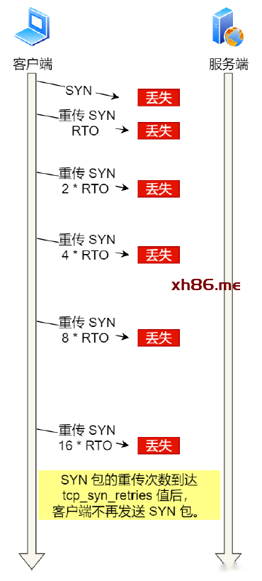 最后,客户端 SYN 超时重传次数达到了 5 次(tcp_syn_retries 默认值 5 次),就不再继续发送SYN 包了。