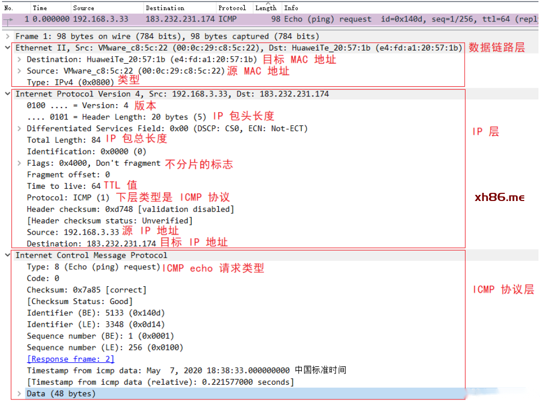 在 Wireshark 的页面里,可以更加直观的分析数据包,不仅展示各个网络包的头部信息,还会用不同的颜色来区分不同的协议,由于这次抓包只有 ICMP 协议,所以只有紫色的条目。接着在网络包列表中选择某一个网络包后,在其下面的网络包详情中,可以更清楚的看到,这个网络包在协议栈各层的详细信息。