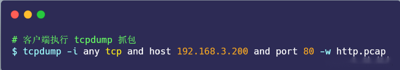 本次例子,我们将要访问的 http://192.168.3.200 服务端。在终端一用 tcpdump 命令抓取数据包:
