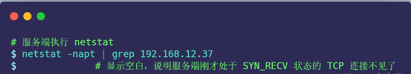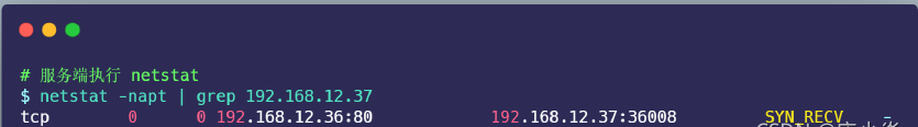 此时,由于服务端收不到第三次握手的 ACK 包,所以一直处于 SYN_RECV 状态: