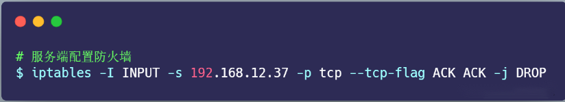 为了模拟 TCP 第三次握手 ACK 包丢,我的实验方法是在服务端配置防火墙,屏蔽客户端 TCP 报文中标志位是 ACK 的包,也就是当服务端收到客户端的 TCP ACK 的报文时就会丢弃,iptables 配置命令如下: