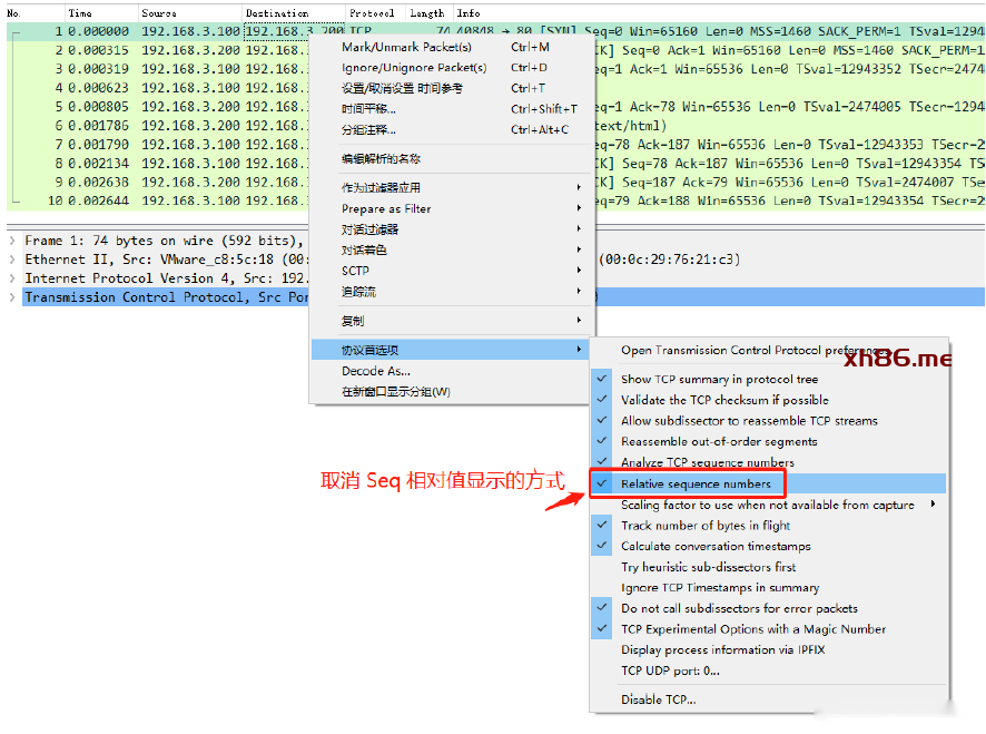 实际上是因为 Wireshark 工具帮我们做了优化,它默认显示的是序列号 seq 是相对值,而不是真实值。如果你想看到实际的序列号的值,可以右键菜单, 然后找到「协议首选项」,接着找到「RelativeSeq」后,把它给取消,操作如下: