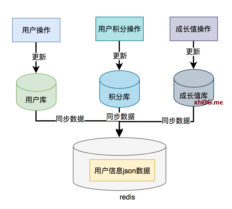 那么,我们能不能把数据冗余一下,把用户信息、积分和成长值的数据统一存储到一个地方,比如:redis,存的数据结构就是用户信息查询接口所需要的内容。然后通过用户id,直接从redis中查询数据出来,不就OK了?