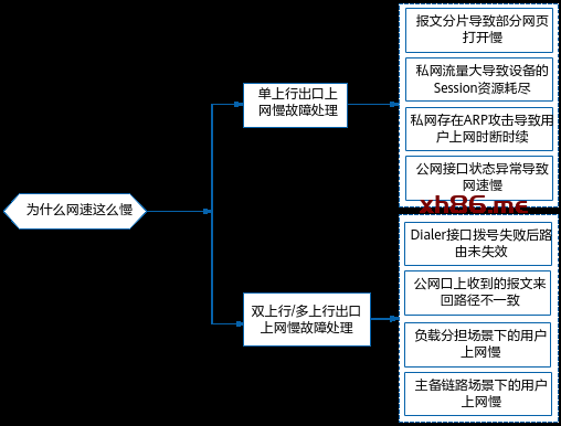 图1-4是用户通过AR上网慢故障树,列出了单上行出口和双上行出口两种场景上网慢的常见原因。