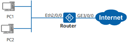 单上行出口上网是指AR路由器和公网之间只有一条上行链路相连。如图1-2所示,AR和Internet之间的连线只有一条,GE3/0/0是连接Internet的接口,也叫作公网口,Eth2/0/0是连接私网的接口,也叫作私网口。该场景常见的上网慢原因包括:TCP最大报文段长度MSS(Max Segment Size)值配置不合理、网络攻击导致设备Session资源耗尽、接口模式协商错误等,具体定位方法请参见单上行出口上网慢故障处理章节。