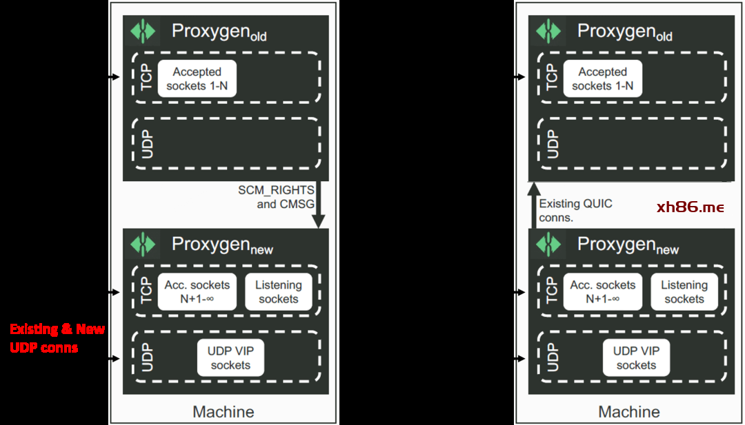 由于 socket 迁移是在内核做的,而内核没有 QUIC 上下文(在应用层维护),因此 当新老进程同时运行时,内核无法知道对于一个现有 UDP 连接的包,应该送给哪个进程 (因为对于 QUIC 没有 listening socket 或 accepted socket 的概念),因此有些包会到老进程,有些到新进程,如下图左边所示;