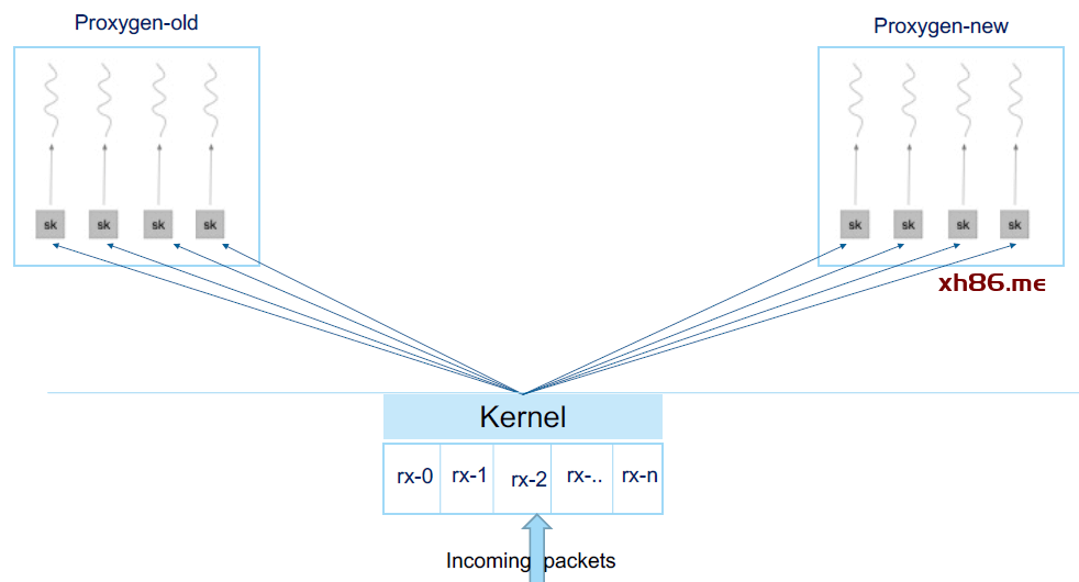 这也解决了扩展性问题,现在可以并发接收包(one-thread-per-socket),不用担心新进程启动时的 disruptions 或 misrouting 了:
