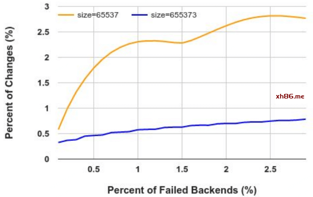 一致性哈希的一个核心特性是具备对后端变化的容错性(resilience to backend changes)。当一部分后端发生故障时,其他后端的哈希表项不受影响(因此对应的连接及主机也不受影响)。Maglev 论文中已经给出了评估这种容错性的指标,如下图,