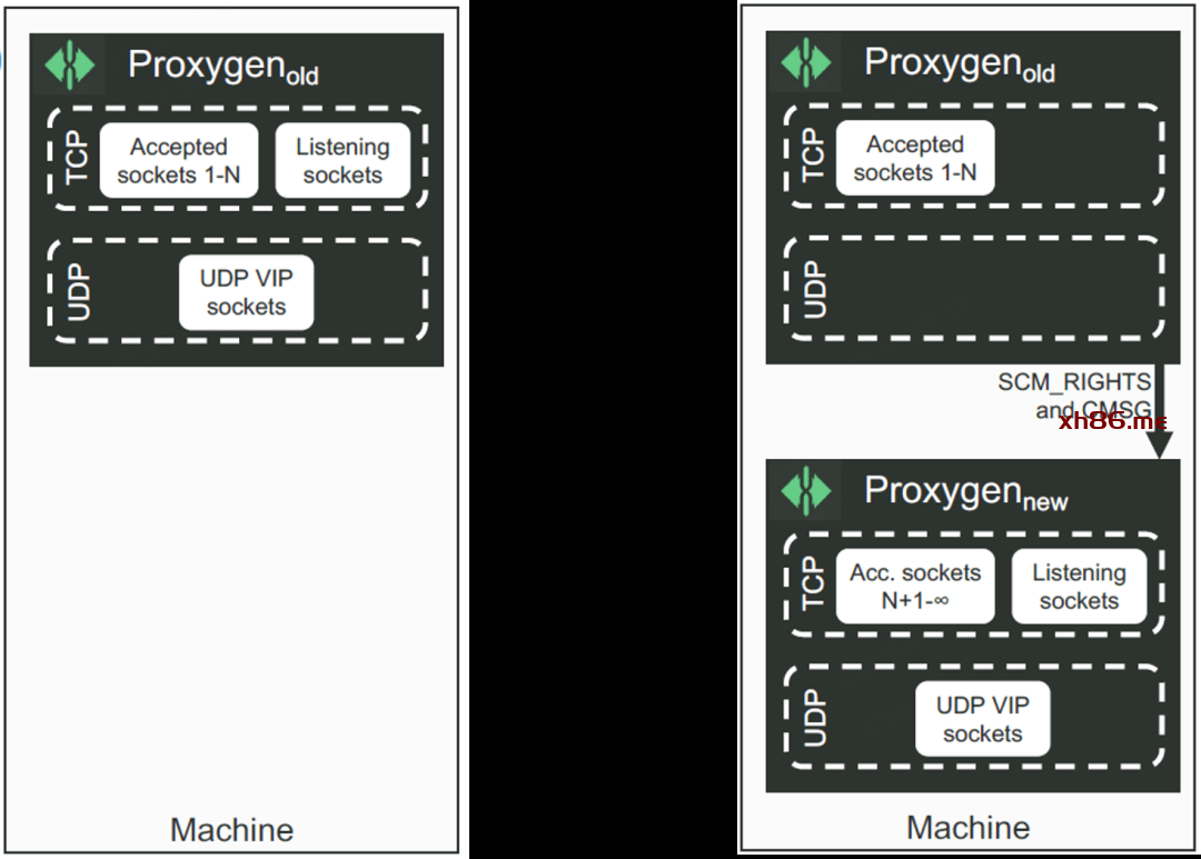 将 TCP listening socket 和 UDP VIP 迁移到新实例;老实例仍然 serving 现有 TCP 连接( 1 ~ N), -