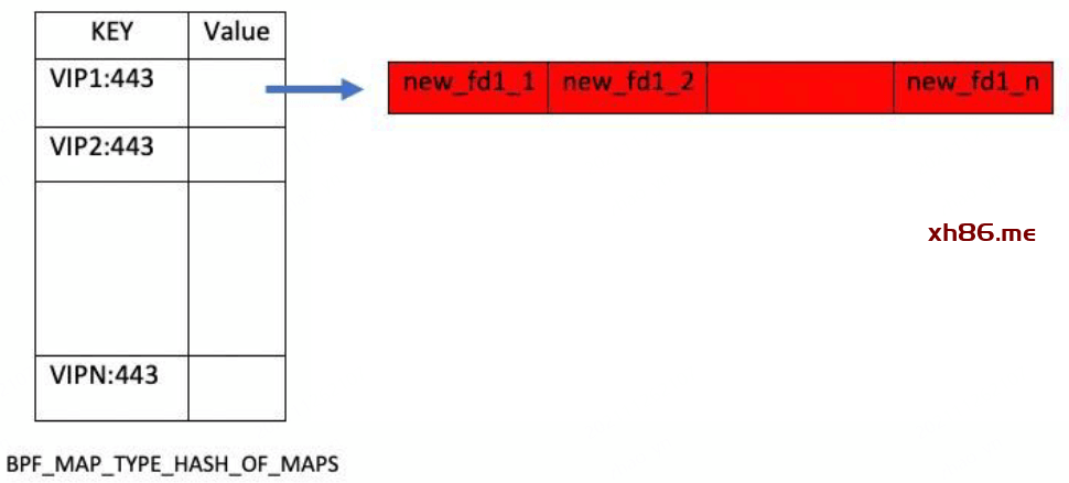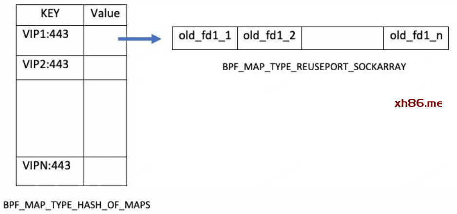 用一个 BPF_MAP_TYPE_REUSEPORT_SOCKARRAY 类型的 BPF map 来配置转发规则,其中,