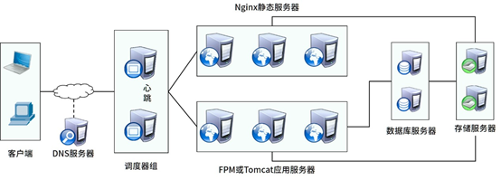 对于网站内容而言可以分离为动态页面和静态页面,静态页面就需要数据文件,动态页面则需要CPU解析代码,需要消耗大量的CPU资源,因此可以将静态和动态分离为两组服务器,动态页面有脚本代码组成,是一种基于网页的应用程序,因此这一组服务器也称为应用服务器,其架构如图-5所示。