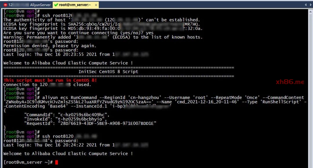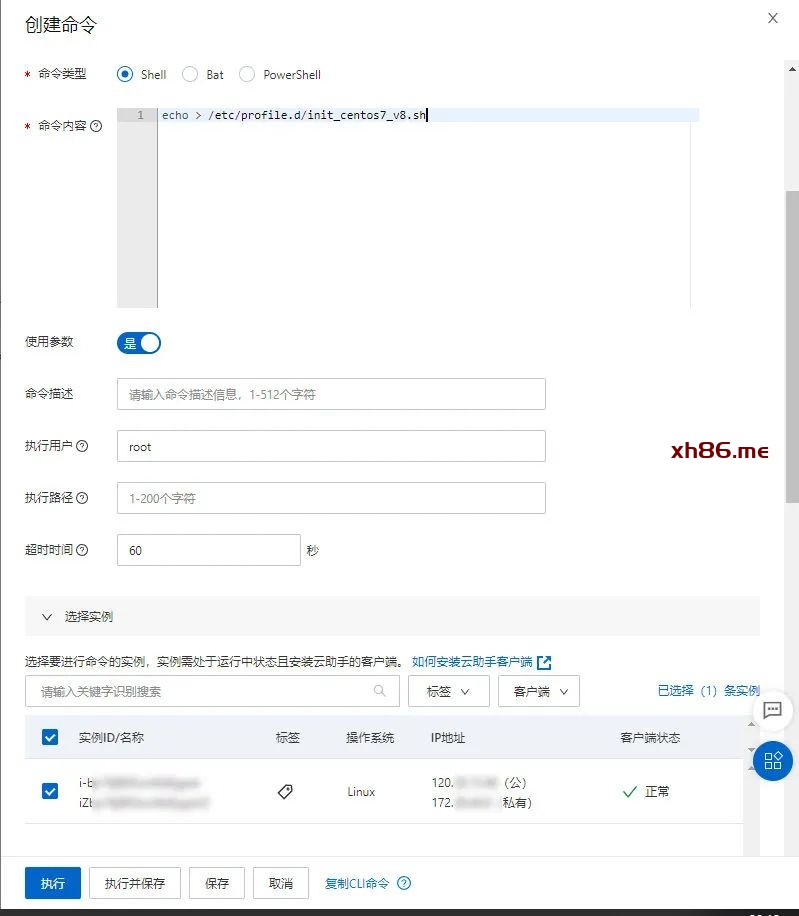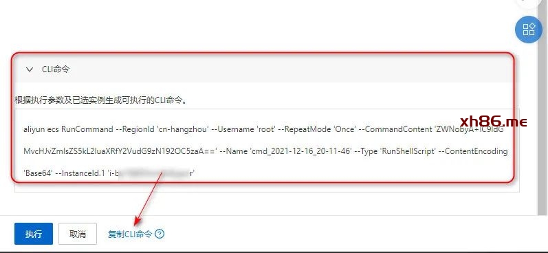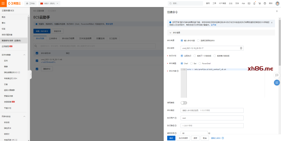 aliyun ecs RunCommand --RegionId 'cn-hangzhou' --Username 'root' --RepeatMode 'Once' --CommandContent 'ZWNobyA+IC9ldGMvcHJvZmlsZS5kL2luaXRfY2VudG9zN192OC5zaA==' --Name 'cmd_2021-12-16_20-11-46' --Type 'RunShellScript' --ContentEncoding 'Base64' --InstanceId.1 'i-bpXXXXXXXXXXXXXX'