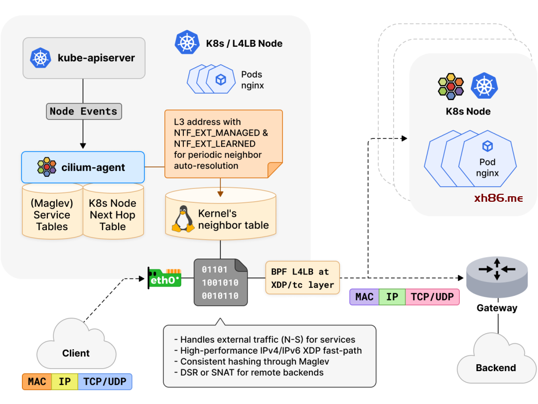 当 Cilium 启用 eBPF 替代 kube-proxy 时,Cilium 会执行集群节点的邻居发现,以收集网络中直接邻居或下一跳的 L2 地址。这是服务负载平衡所必需的,eXpress Data Path[29] (XDP) 快速路径支持每秒数百万数据包的可靠高流量速率。在这种模式下,在技术上按需动态解析是不可能的,因为它需要等待相邻的后端被解析。