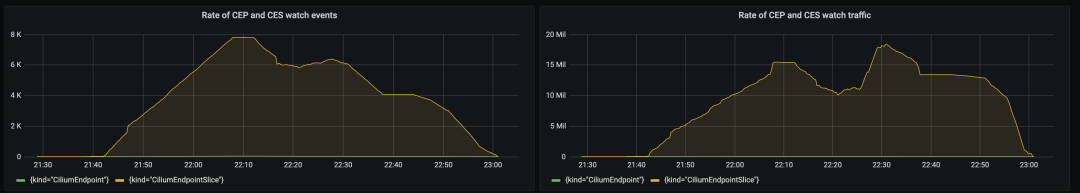 GKE 最早采用了 CES,我们在 GKE 上进行了一系列“最坏情况”规模测试,发现 Cilium 在 CES 模式下的扩展性要比 CEP 模式强很多。从 1000 节点规模的负载测试来看,启用 CES 后,watch 事件的峰值从 CEP 的 18k/s 降低到 CES 的 8k/s,watch 流量峰值从 CEP 的 36.6Mbps 降低到 CES 的 18.1Mbps。在控制器节点资源使用方面,它将 CPU 的峰值使用量从 28 核/秒减少到 10.5 核/秒。
