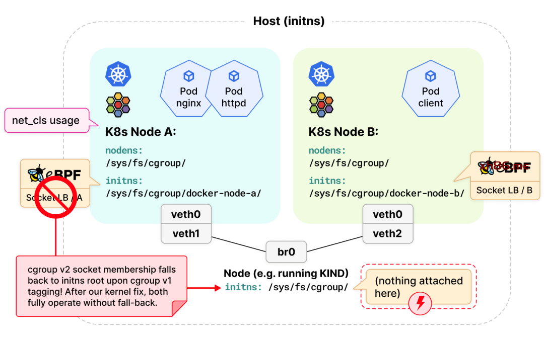 Linux 在内核的 socket 对象中标记了 socket 与 cgroup 的关系,并且由于 6 年前的一个设定,cgroup v1 和 v2 的 socket 标签是互斥的。这就意味着,如果一个 socket 是以 cgroup v2 成员身份创建的,但后来通过具有 cgroup v1 成员身份的 net_prio 或 net_cls 控制器进行了标记,那么 cgroup v2 就不会执行附加在 Pod 子路径上的程序,而是回退执行附加到 cgroup v2 层次结构 (hierarchy) 根部的 eBPF 程序。这样就会导致一个很严重的后果,如果连 cgroup v2 根部都没有附加程序,那么整个 cgroup v2 层次结构 (hierarchy) 都会被绕过。