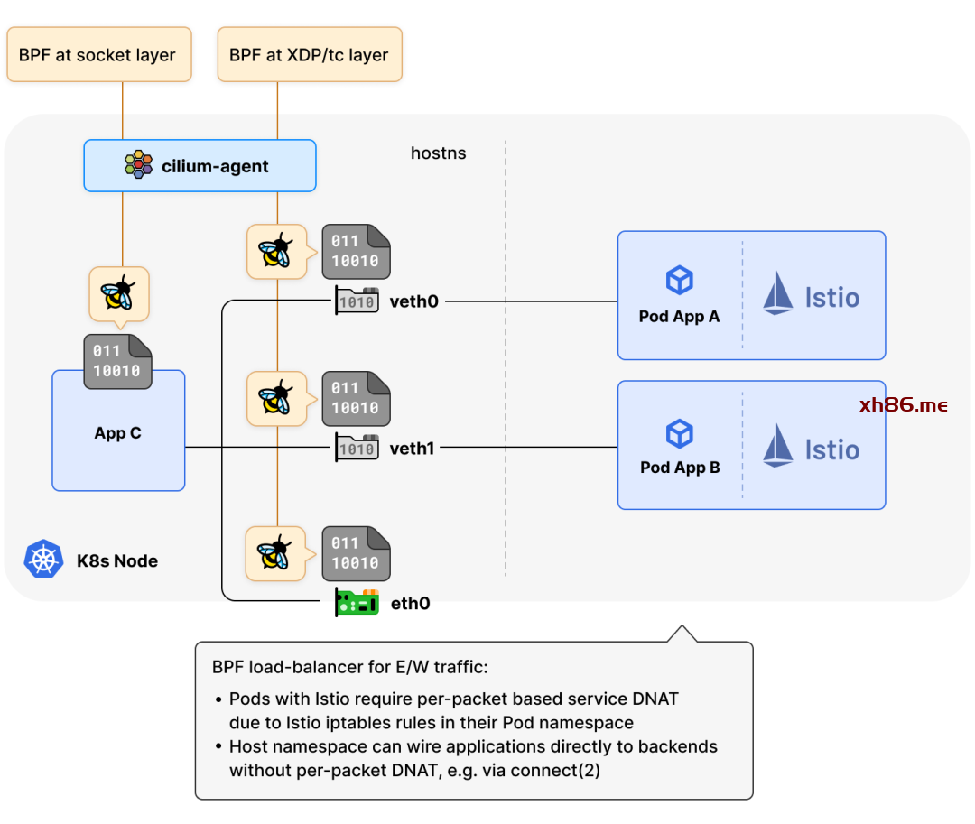 所以在 Istio 等服务网格场景下,Cilium 改进了对 Pod 之间(东西方向)流量的处理方式,改成基于 eBPF 的 DNAT 完成对每个数据包的处理,而主机命名空间内的应用仍然可以使用基于 socket 的负载均衡器,以避免每个数据包的 NAT 转换成本。