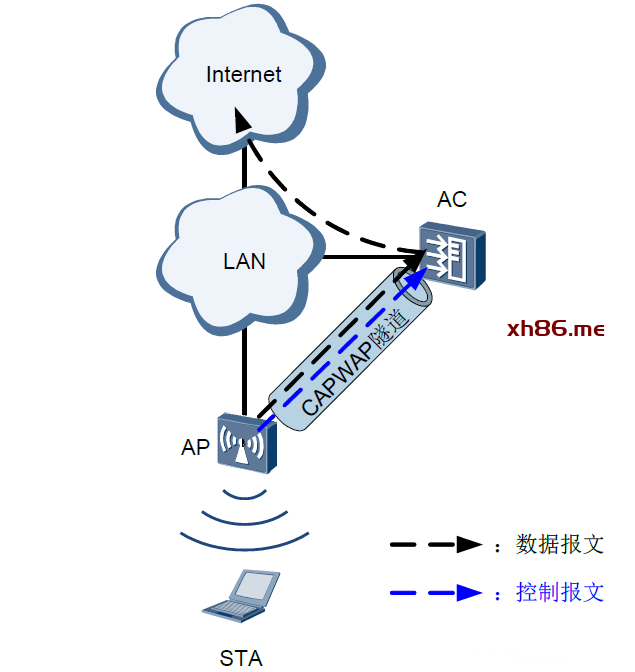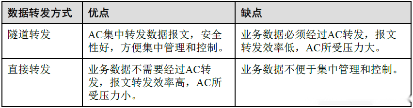 WLAN网络中的数据包括控制报文和数据报文。控制报文是通过CAPWAP的控制隧道转发的,用户的数据报文按照是否通过CAPWAP的数据隧道转发分为隧道转发(又称为“集中转发”)方式和直接转发(又称为“本地转发”)方式。