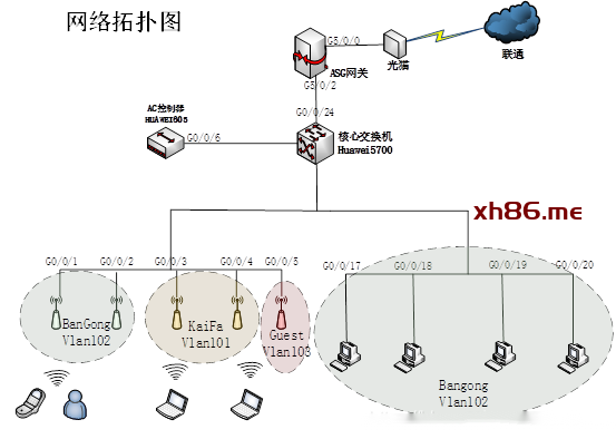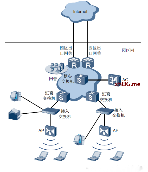 大中型园区网的集中式AC组网方案如图所示:(旁挂式部署)