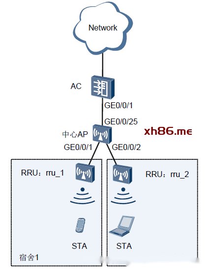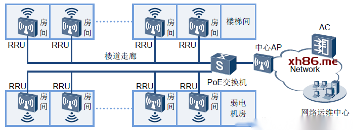 如下图所示,AC连接中心AP,再由中心AP连接RRU并为其提供PoE供电,在每个宿舍中部署一个RRU,所有RRU和中心AP统一由AC进行集中管理,为每个宿舍提供高质量的WLAN网络覆盖。