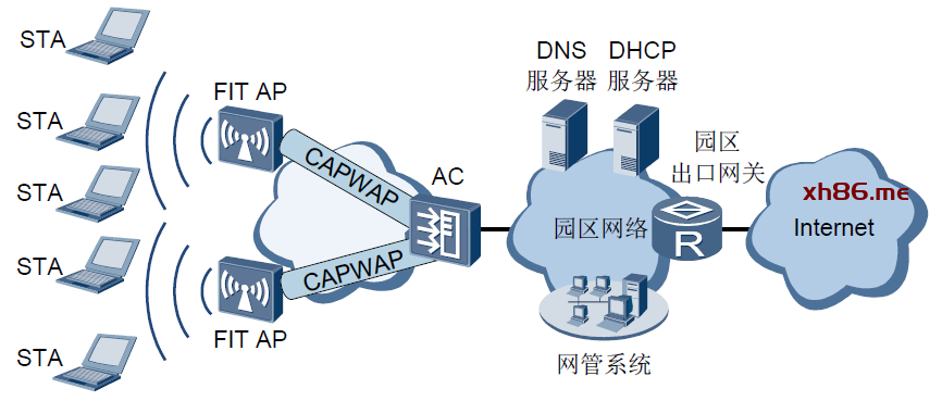 集中式架构又称为瘦接入点(FIT AP)架构。在该架构下,通过AC集中管理和控制多个AP,如下图所示。
