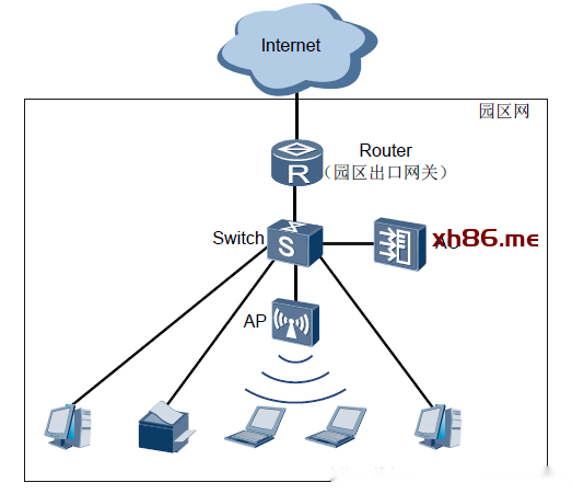 小型园区网定位为中小型企业包括独立的小型园区网,也包括只在分支机构部署WLAN的场景。小型园区网WLAN部署规模小于大型园区但高于SOHO。相对于大型WLAN网络而言,小型园区网WLAN可能较少考虑网络可靠性,可能因为成本因素而不需要专门的网管设备以及认证服务器。小型园区网由于规模较小,一般采用集中式AC方案。可采用独立AC设备或者集成AC设备的部署方式,如图所示(以独立AC设备为例)。