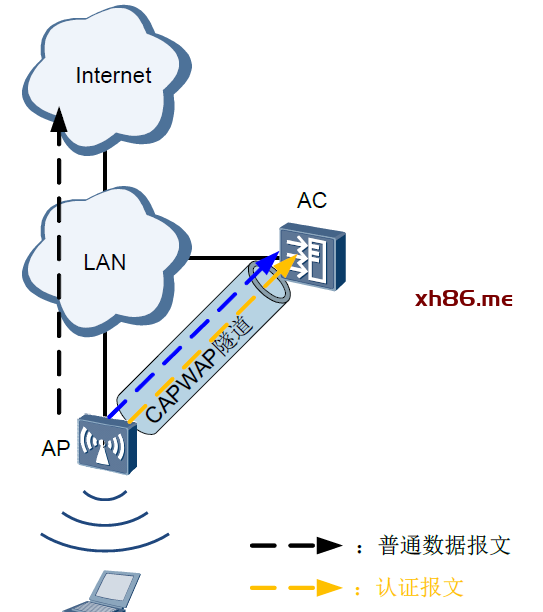如果采用直接转发方式,业务数据不经过AC转发。当无线用户接入网络需要进行用户接入认证(例如,802.1X认证等)且接入控制点部署在AC上时,用户的认证报文就无法通过AC集中管理,这就给管理员对用户的统一控制造成了不便。通过在直接转发方式下使能集中认证功能,可以实现用户的认证报文通过CAPWAP隧道到达AC转发,普通数据报文不需要经过AC转发,如下图所示: