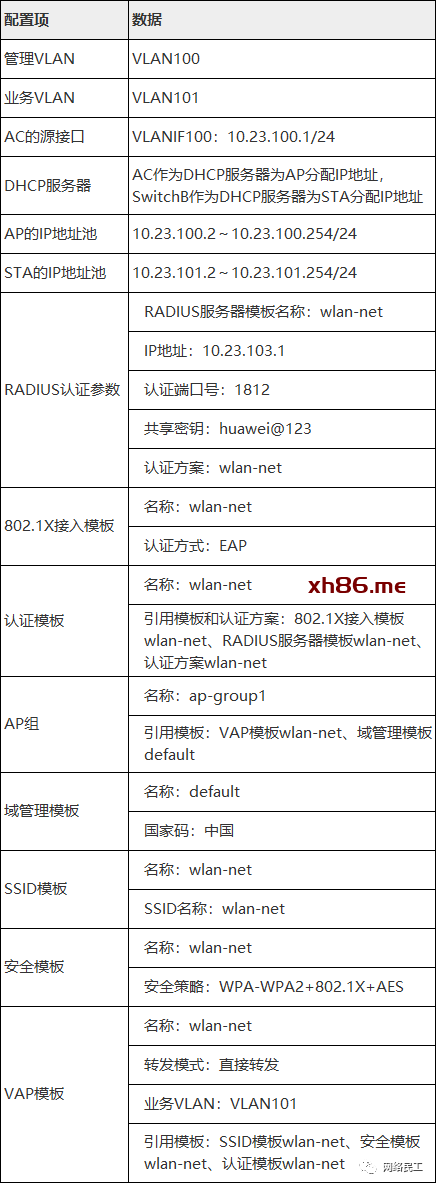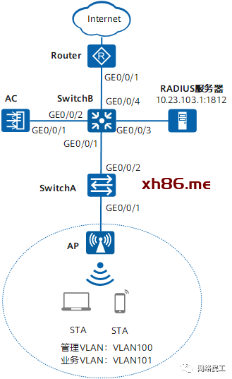 - DHCP部署方式:AC作为DHCP服务器为AP分配IP地址,SwitchB作为DHCP服务器为STA分配IP地址。
