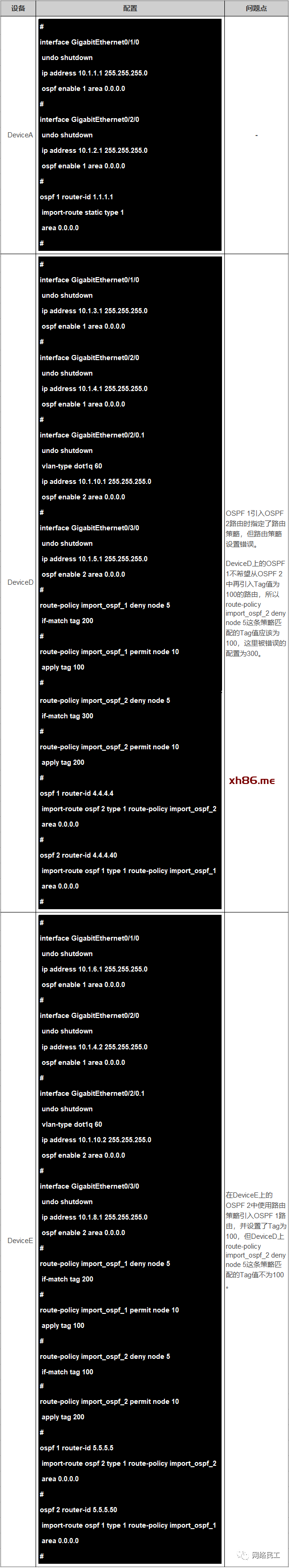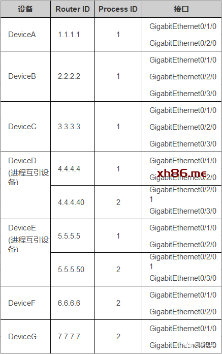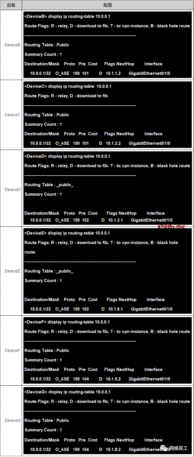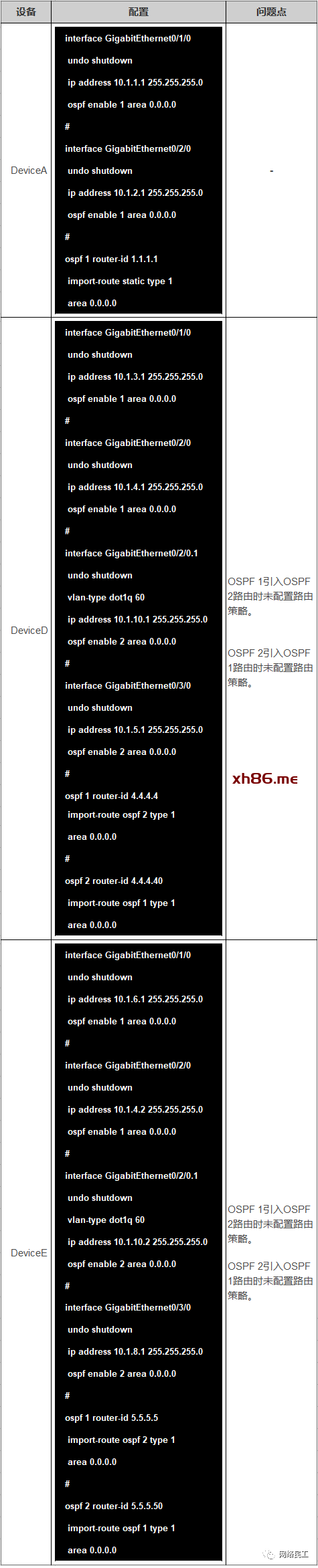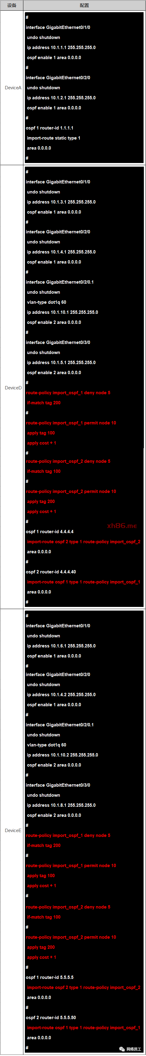 以DeviceA的OSPF 1上引入10.0.0.1/32路由为例,关键配置如下: