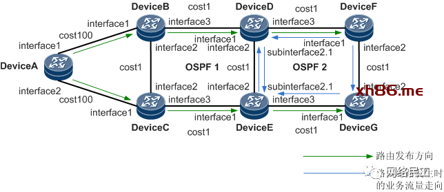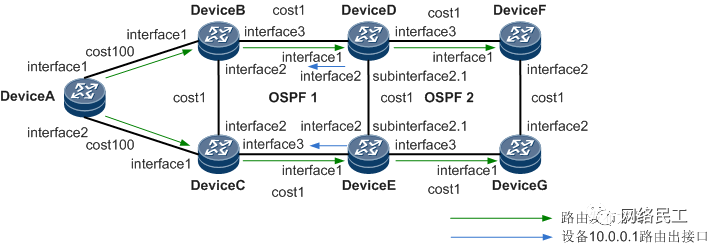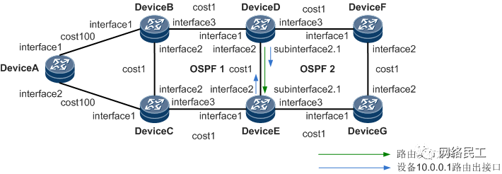 如图 1 所示,DeviceA、DeviceB、DeviceC、DeviceD、DeviceE运行OSPF 1,DeviceD、DeviceE、DeviceF、DeviceG运行OSPF 2。在DeviceD、DeviceE设备上,OSPF 1和OSPF 2做路由的互相引入,且未配置引入路由策略,或者配置路由策略不合理,如匹配前缀错误、Tag值不匹配等,OSPF 1发布的路由,通过OSPF 2重新发布回OSPF 1。由于新发布的路由的Cost值更小,成为优选路由,从而导致环路。