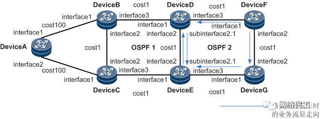 DeviceD和DeviceE的OSPF 2上配置引入OSPF 1路由,且未配置引入路由策略,或者配置路由策略不合理。如图 3 所示,以DeviceE为例,在阶段一DeviceE路由表中的OSPF 1到10.0.0.1的路由活跃,此时会触发OSPF 2 引入OSPF 1到10.0.0.1的路由,并发布5类LSA在OSPF 2进程域中洪泛。DeviceD的OSPF 2收到这条LSA后,会计算到10.0.0.1的路由,计算得到的路由cost值为2,小于OSPF 1计算的cost值为102的路由,因此DeviceD路由表中到10.0.0.1的活跃路由由OSPF 1更新为OSPF 2,此时出接口为subinterface2.1。
