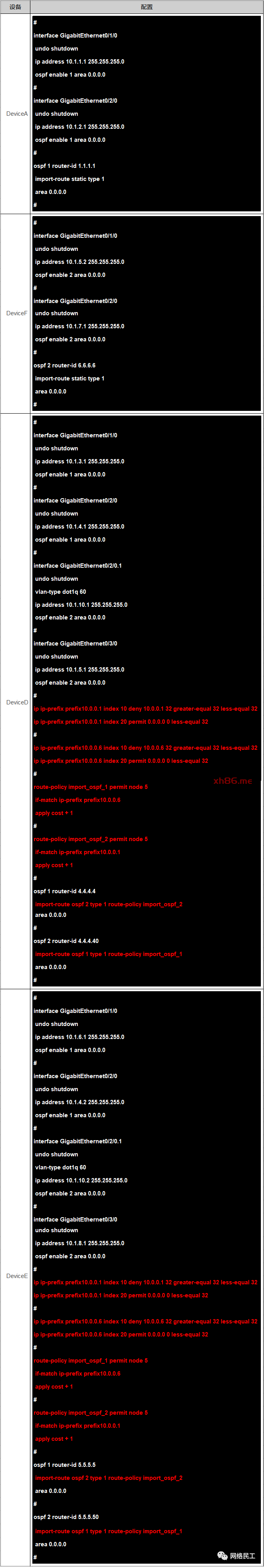 以DeviceA的OSPF 1上引入10.0.0.1/32,DeviceF的OSPF 2引入10.0.0.6/32为例,关键配置如下: