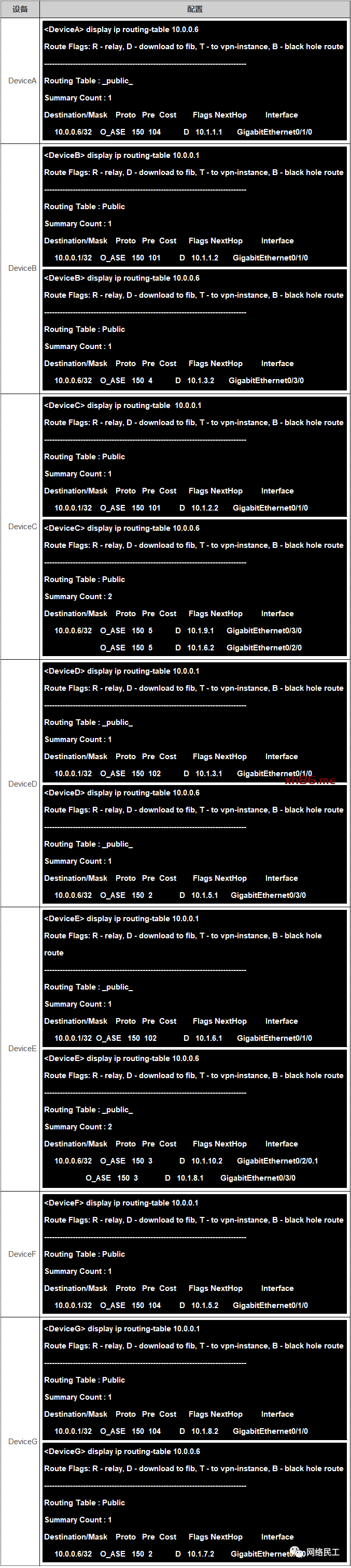 分别在各台设备上查询到10.0.0.1/32路由,以检查配置结果: