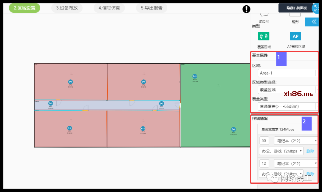 网络覆盖设计是指针对无线网络覆盖的普通区域、简单区域或VIP区域进行设计规划,保证每个区域覆盖范围内的信号强度能满足用户的要求,并且解决相邻AP间的同频干扰问题。