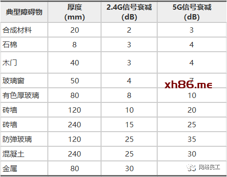 从历史的经验数据总结出典型障碍物的衰减可以参考下表,实际准确的衰减数值建议以实际工勘的结果为准。