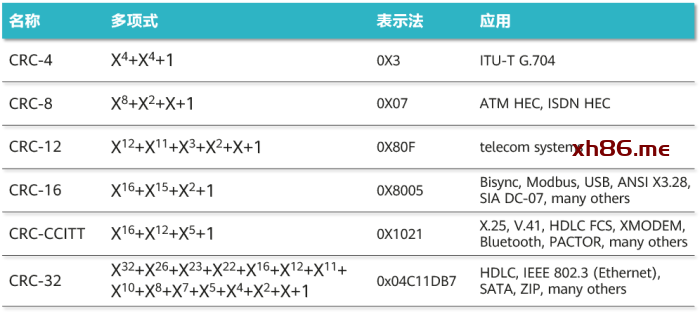 g(x)叫做这个校验码的生成多项式。不同的CRC生成多项式,其检错能力是不同的。要使用R位校验码,生成多项式的次幂应为R。以下为常见的一些标准多项式。