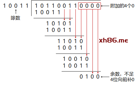 以g(x)为CRC-4=X4+X+1为例,此时除数P=10011。假设源数据M为10110011。