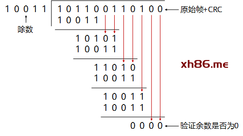 计算得到的余数就是0100,也就是CRC校验码。将0100附加到原始数据帧10110011后,组成新帧101100110100发送给接收端。接收端接收到该帧后,会用该帧去除以上面选定的除数P,验证余数是否为0,如果为0,则表示数据在传输过程中没有出现差错。