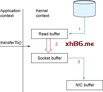 在此模型下,上下文切换的数量减少到一个。具体而言,transferTo()方法指示块设备通过 DMA 引擎将数据读取到读取缓冲区中。然后,将该缓冲区复制到另一个内核缓冲区以暂存到套接字。最后,套接字缓冲区通过 DMA 复制到 NIC 缓冲区。